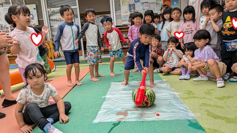 年少さん、年中さんもスイカ割りに挑戦したけどなかなか割れず・・・さすがの年長さん!見事にスイカが割れました!