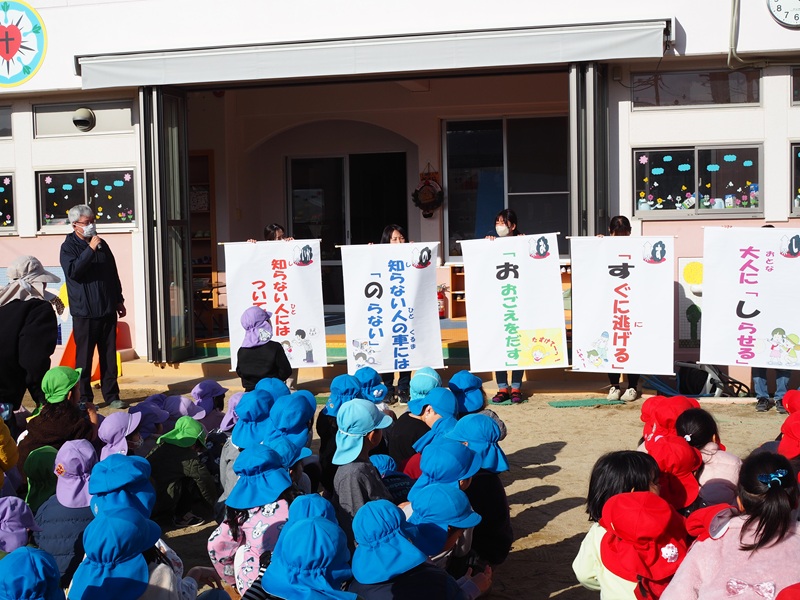 朝は不審者の避難訓練があり、避難訓練の後は東広島警察署の生活安全課の方に「いかのおすし」についてお話をしていただきました!