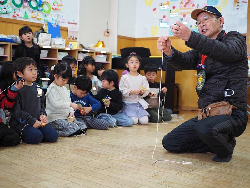避難訓練のあとは年長組が「「こまめいじん」さんにこまの回し方を教えてもらいましたよ!