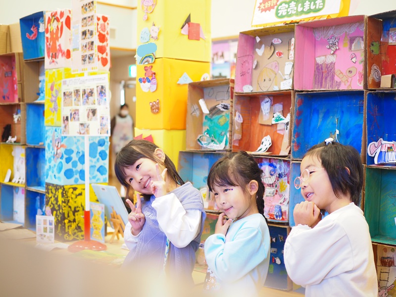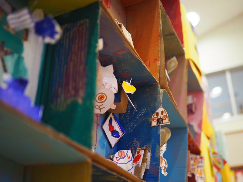 年長組は立体共同作品に『100かいだてのいえ』、ゆり組は『ぞうのエルマー』『スイミー』、ひまわり組は『そらまめのベッド』『にじいろのさかな』の絵本をテーマに製作しました。