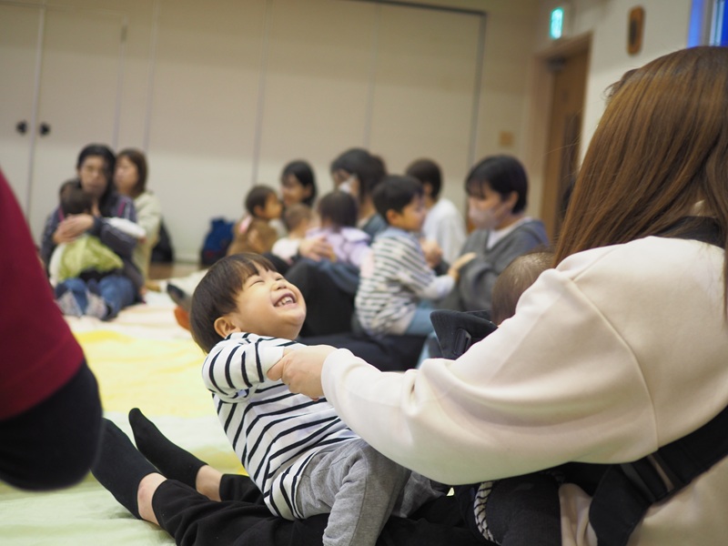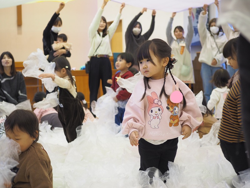 フラップバルーン、ビニール袋のお風呂、大きな絵本を読んだり、太鼓を叩いてみたり…