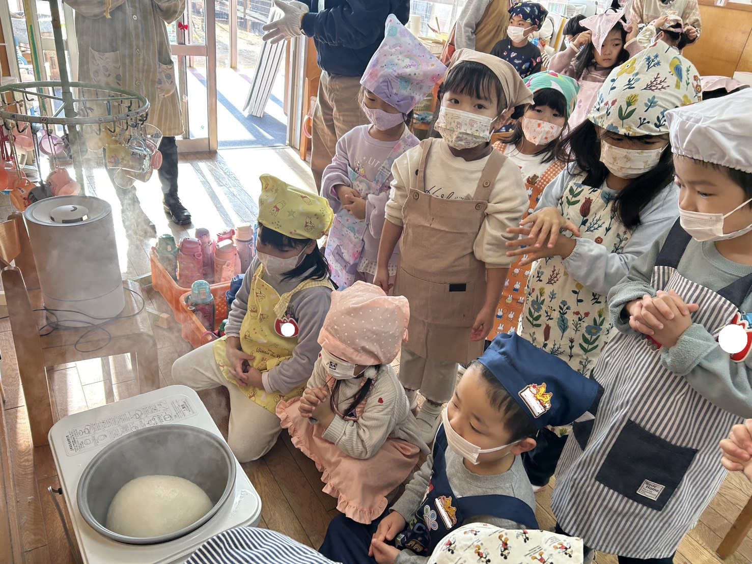 もちつき機でもち米からおもちに変身していく様子をみんなでみたり、臼に入れたおもちを杵で打ったり、あったかいおもちを丸めたり…