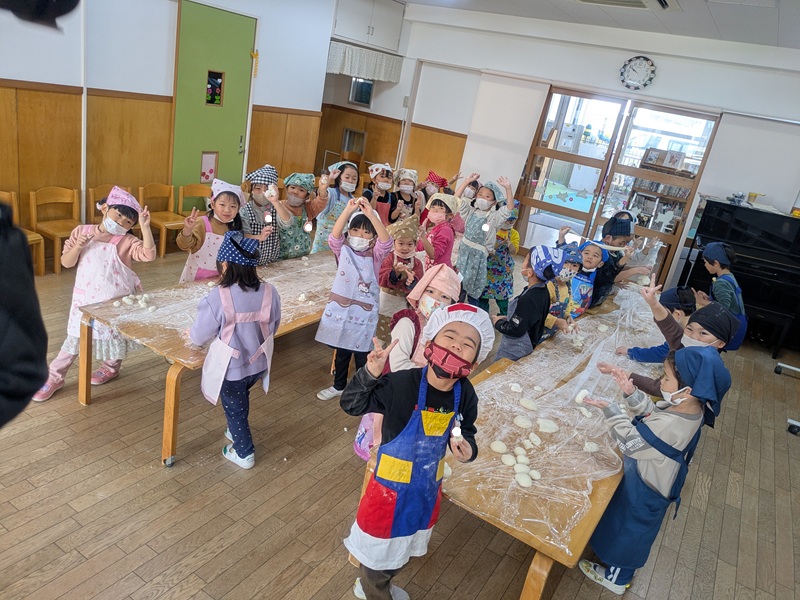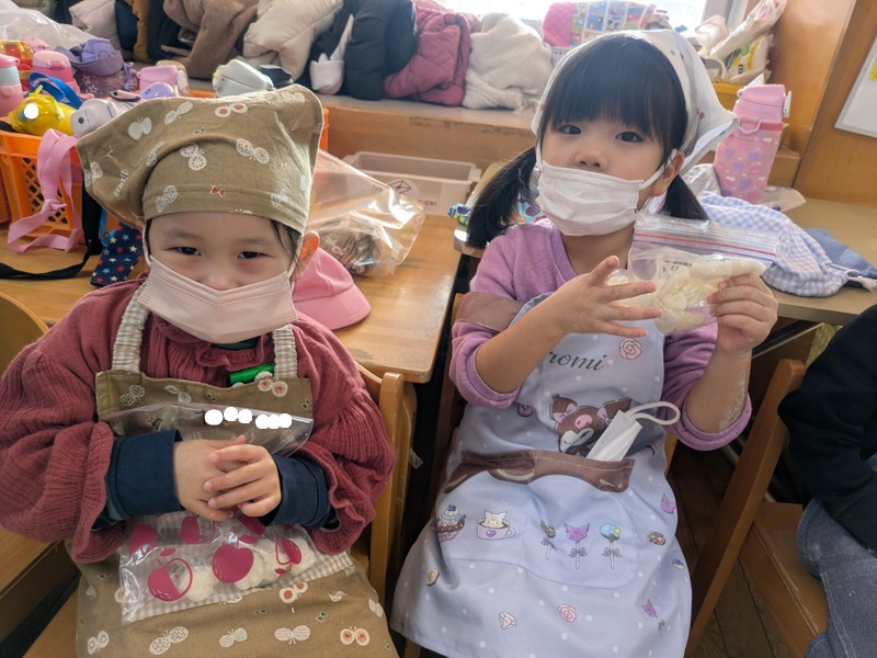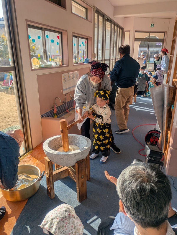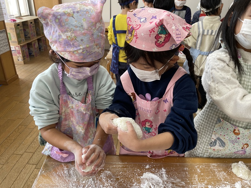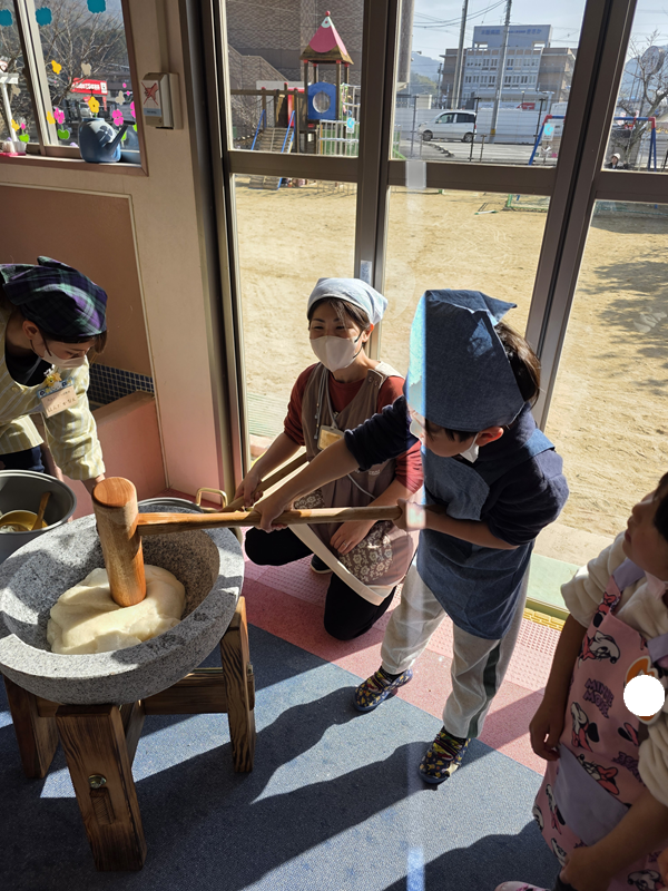 登園するときから「きょうはおもちつきだよね~!」と楽しみにしてくれていたり、うきうきのお顔でエプロンを見せてくれたり、かわいい表情をたくさん見ることができました!
