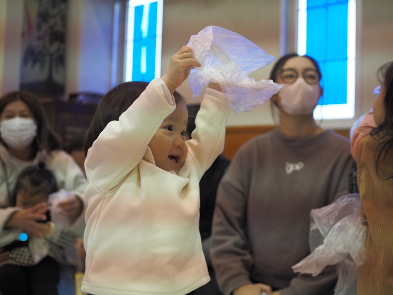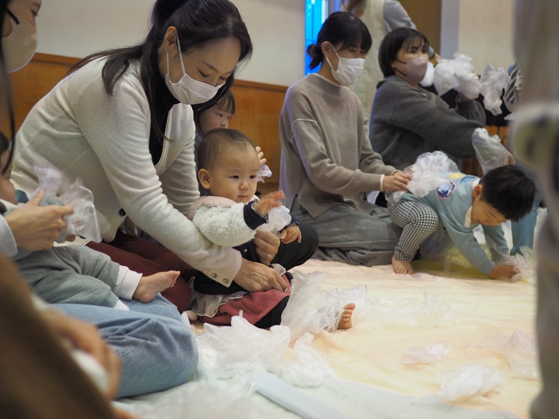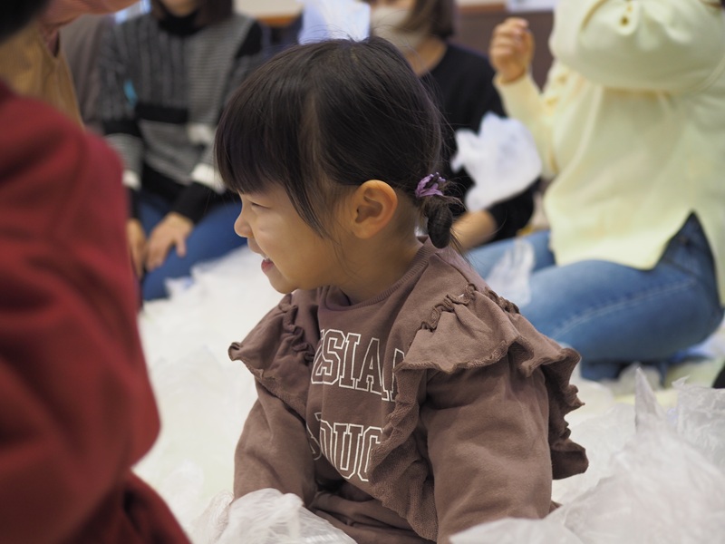 フラップバルーン、ビニール袋のお風呂、大きな絵本を読んだり、太鼓を叩いてみたり…