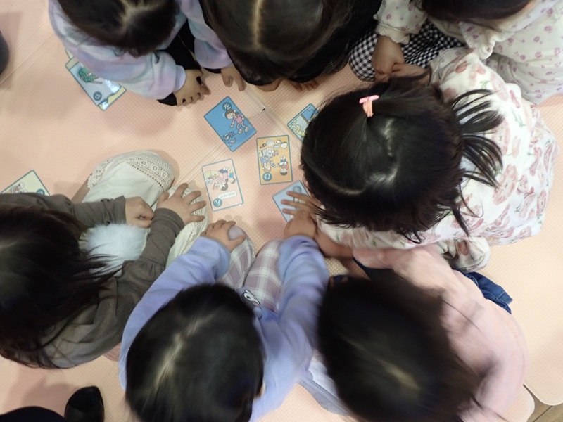 なかなか取れなくて悔しくて涙が出てしまうお友だちもいましたが、先生におしまいの時「今日は防災かるただから、とってもとってなくても、災害の時にどうしたらいいのかがわかった人の勝ちだよ」と伝えてもらっていましたよ♪